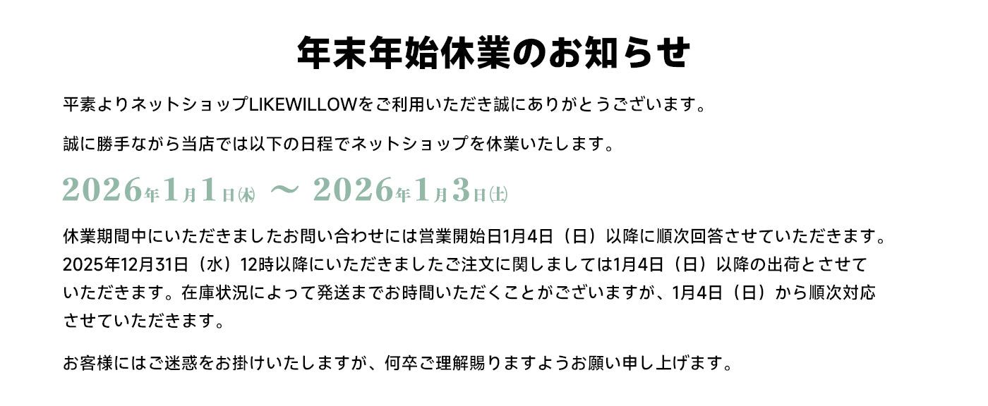 商品の管理、発送には細心の注意を払っておりますが、万一「不良品(破損、汚損など)」「商品違い」「数量違い」がございます場合は、当方送料負担で交換または返品対応いたします。その場合は大変お手数ですが、商品受取後14日以内にお問い合わせもしくはinfo@likewillow.comまでご連絡ください。