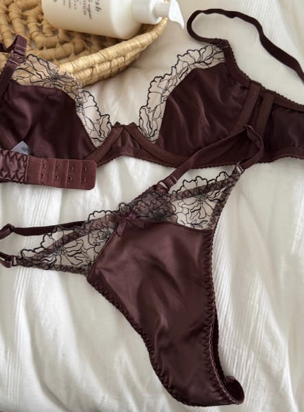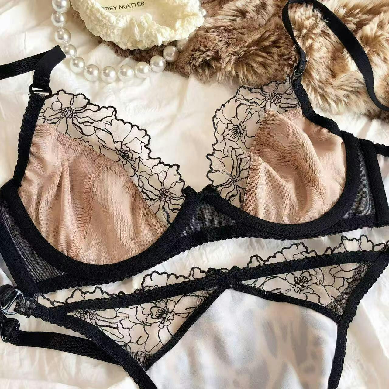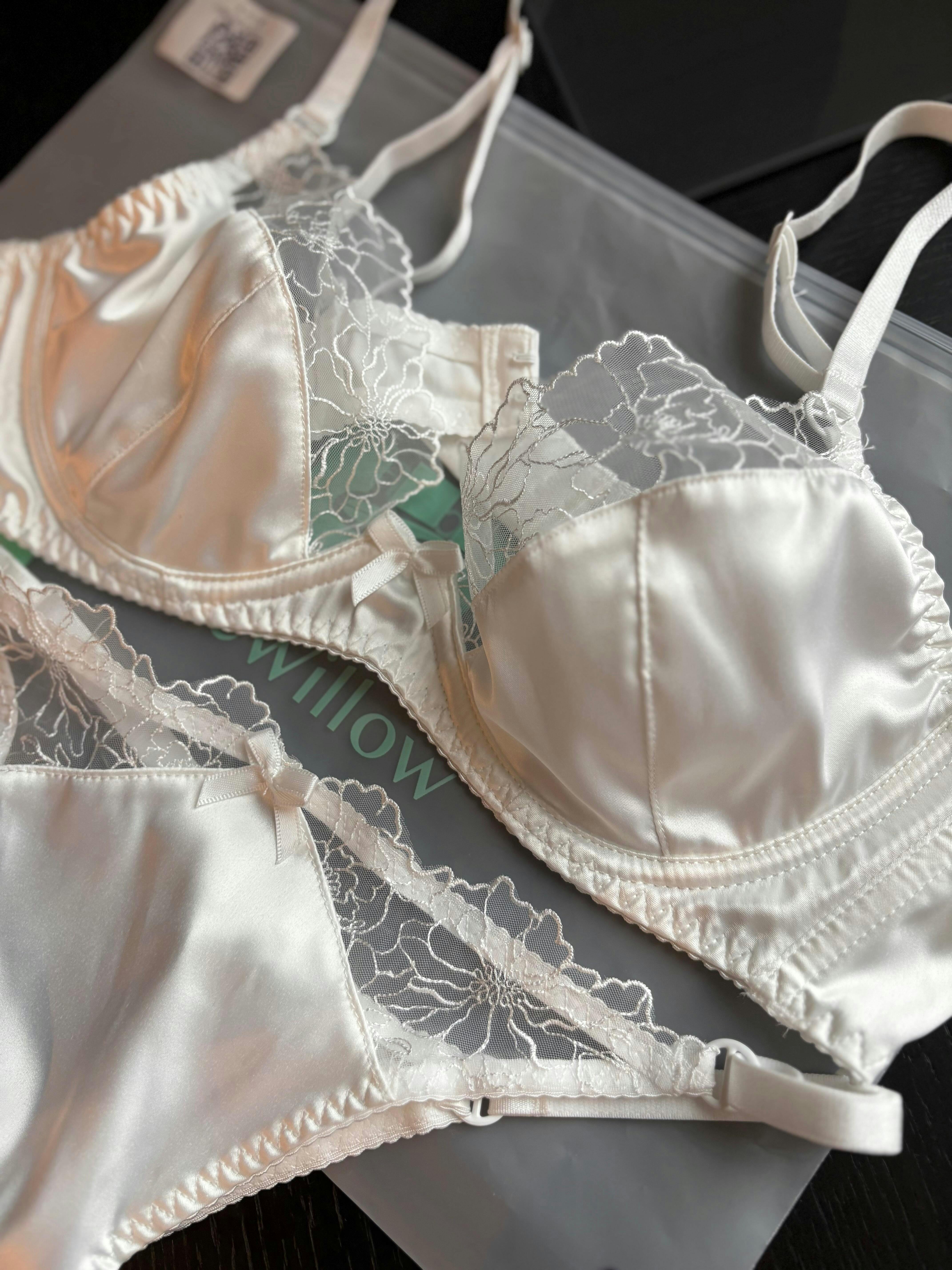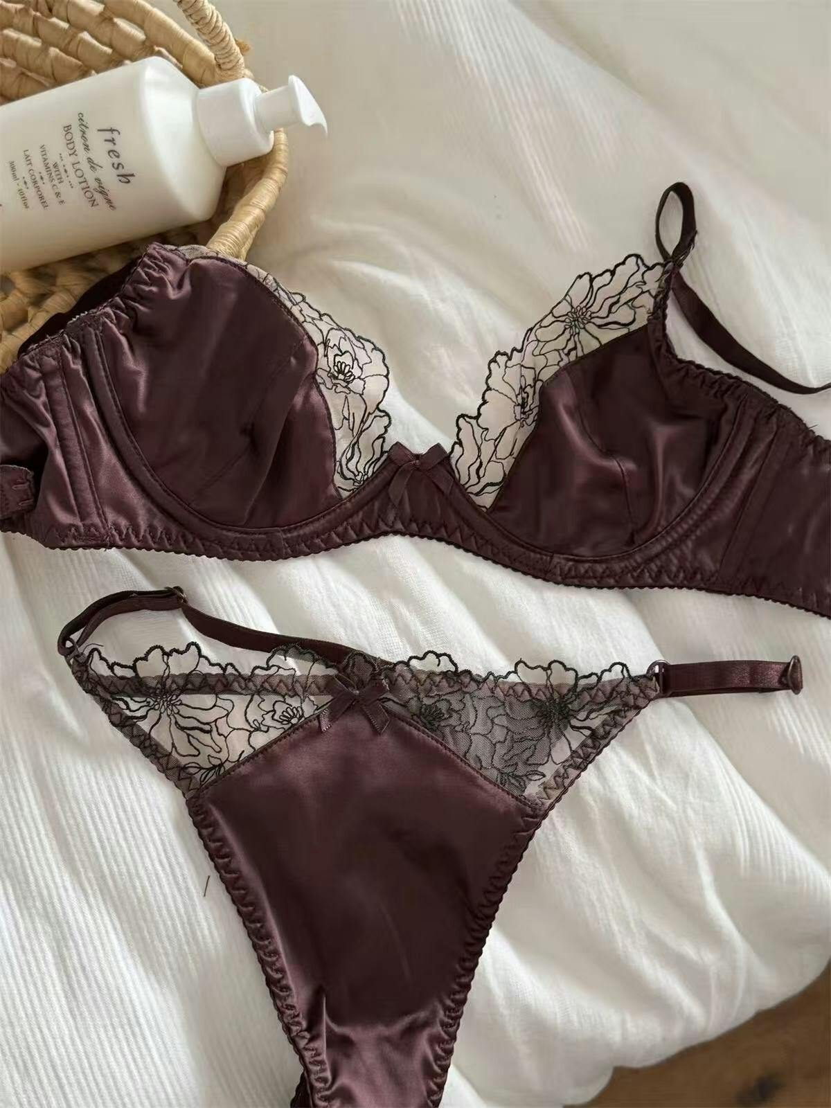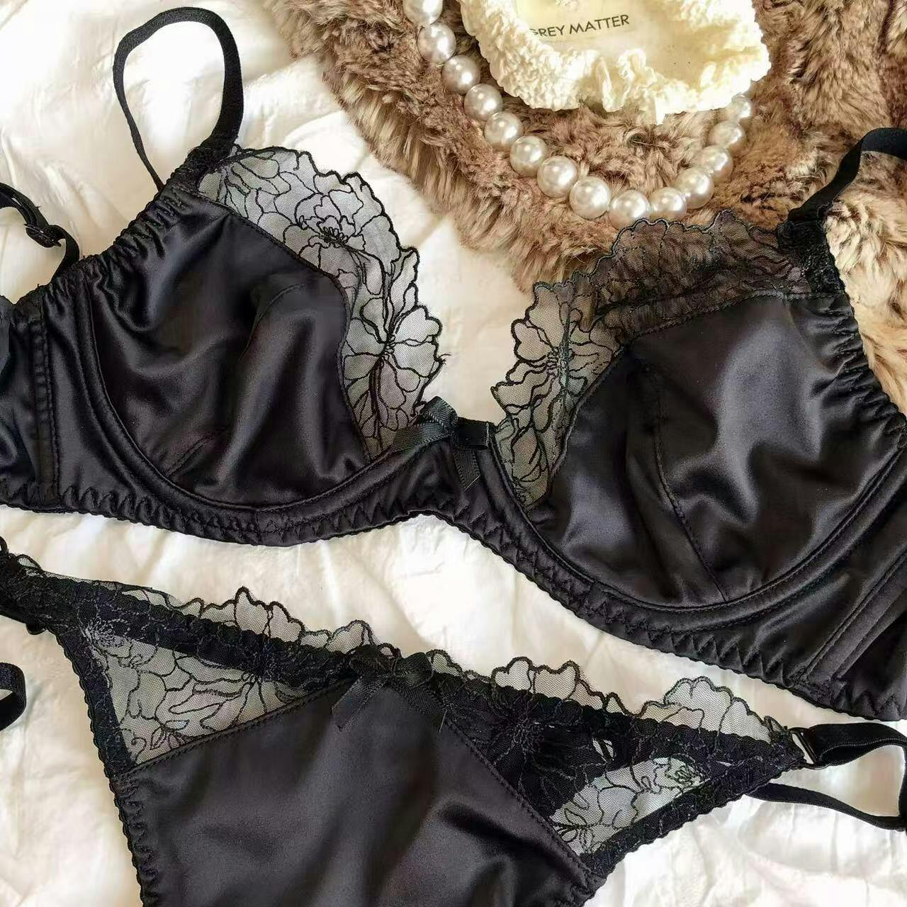 - 繊細な線画レースの透け感とサテンのしっとりとした艶が美しい、大人のノンパデッドブラセット。